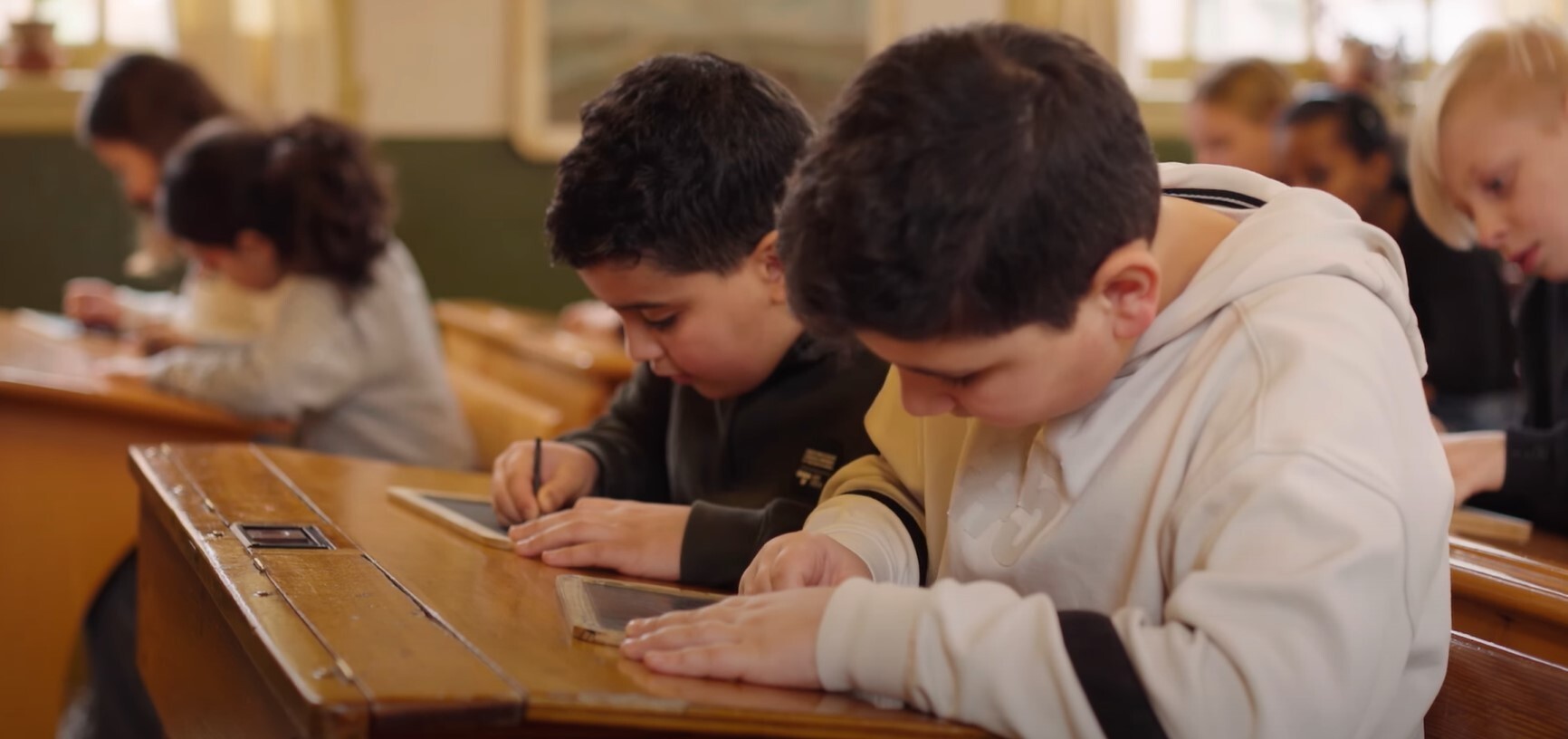 Sitting in the benches of a historic classroom, students attend a school class as children did in 1930.