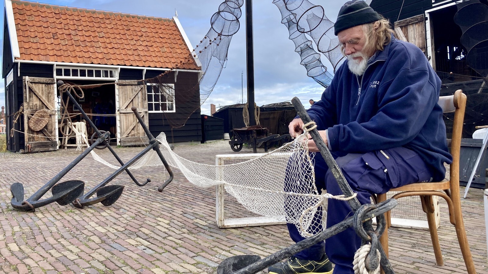 Rook stijgt op uit een grote ketel boven een hout gestookt vuur. Er hangen netten in een hoge mast te drogen in de wind. Vanuit de boet klinkt geroezemoes en gelach. Als je dichterbij komt zie je twee mannen ijverig aan het werk. De één is een nieuwe fuik aan het breien terwijl de ander een versleten net boet (repareert).
