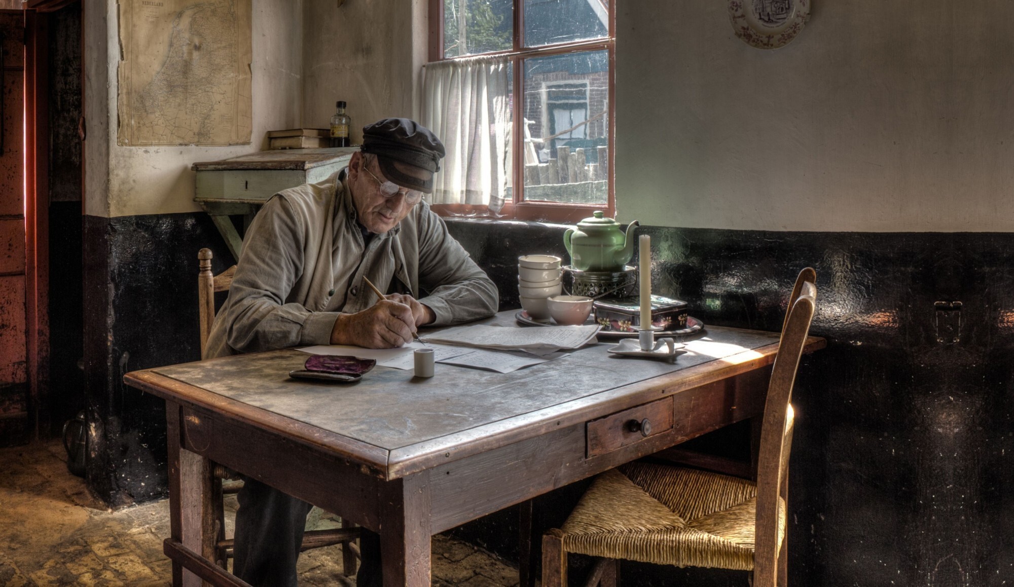 "Klopt, dat ziet u goed. Ik ben geen Urker. Ik kwam als jongetje van 4 met mijn ouders van Egmond naar hier. Ik ben geen visser maar briefsteller. Jazeker ik kon goed leren en ben op mijn best met woorden en cijfers. Altijd al geweest. Maar ik ben niet echt geschikt voor schoolmeester of klerk…. Tegenwoordig help ik de landers tegen Sint Jan met het markeren van het hooiland. Dat is ook een secuur werkje hoor. Je moet goed meten anders is het meteen goed mis. En verder….Ach, geen zorg. Ik scharrel mijn kostje wel bij elkaar."